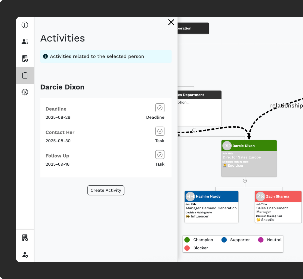 See, create and complete CRM activities and crm tasks inside your account map - always up to date and in sync with the crm