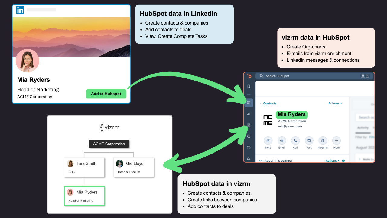 Reduce manual work by using the vizrm integration for HubSpot. Seamlessly sync leads and enrich them with emails directly from LinkedIn. Push them to Hubspot and build org charts and account maps to reduce admin work, and aligned sales activities.
