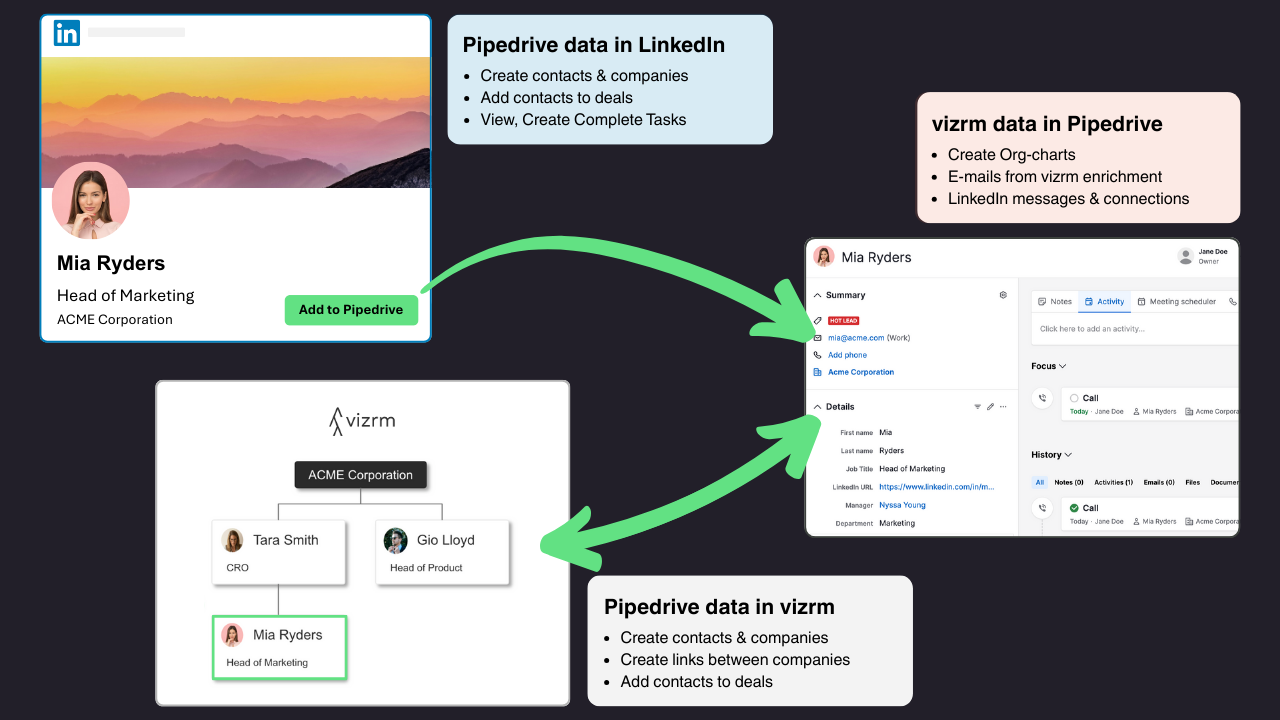Reduce manual work by using the vizrm integration for Pipedrive. Seamlessly sync leads and enrich them with emails directly from LinkedIn. Push them to Pipedrive and build org charts and account maps to reduce admin work, and aligned sales activities.